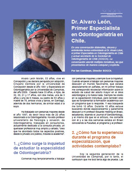 En el Boletín Electrónico de la Sociedad de Odontogeriatría de Chile @SOGCh2018 Nº 3, agosto de 2020, entrevistamos al Dr Alvaro León Morán, primer odontólogo chileno especialista en Odontogeriatría.